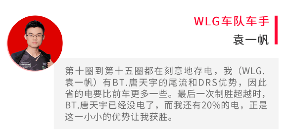 从第十四圈起,双头的 螺栓前两名的争夺更加白热化,WLG.袁一帆刻意保持电量,他在BT.唐天宇身后0.5秒的位置,酝酿着超车机会。