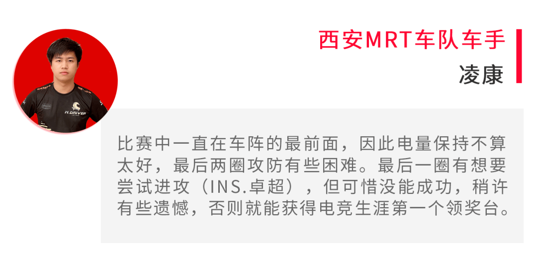 凌康是西安MRT车队在这两轮收获的更大宝藏,这位在现实中同样出色的线电竞中国赛的一匹黑马。本轮不仅获得了17个积分位列第六,还获得了进步最快车手,成功当选第六轮MVP。